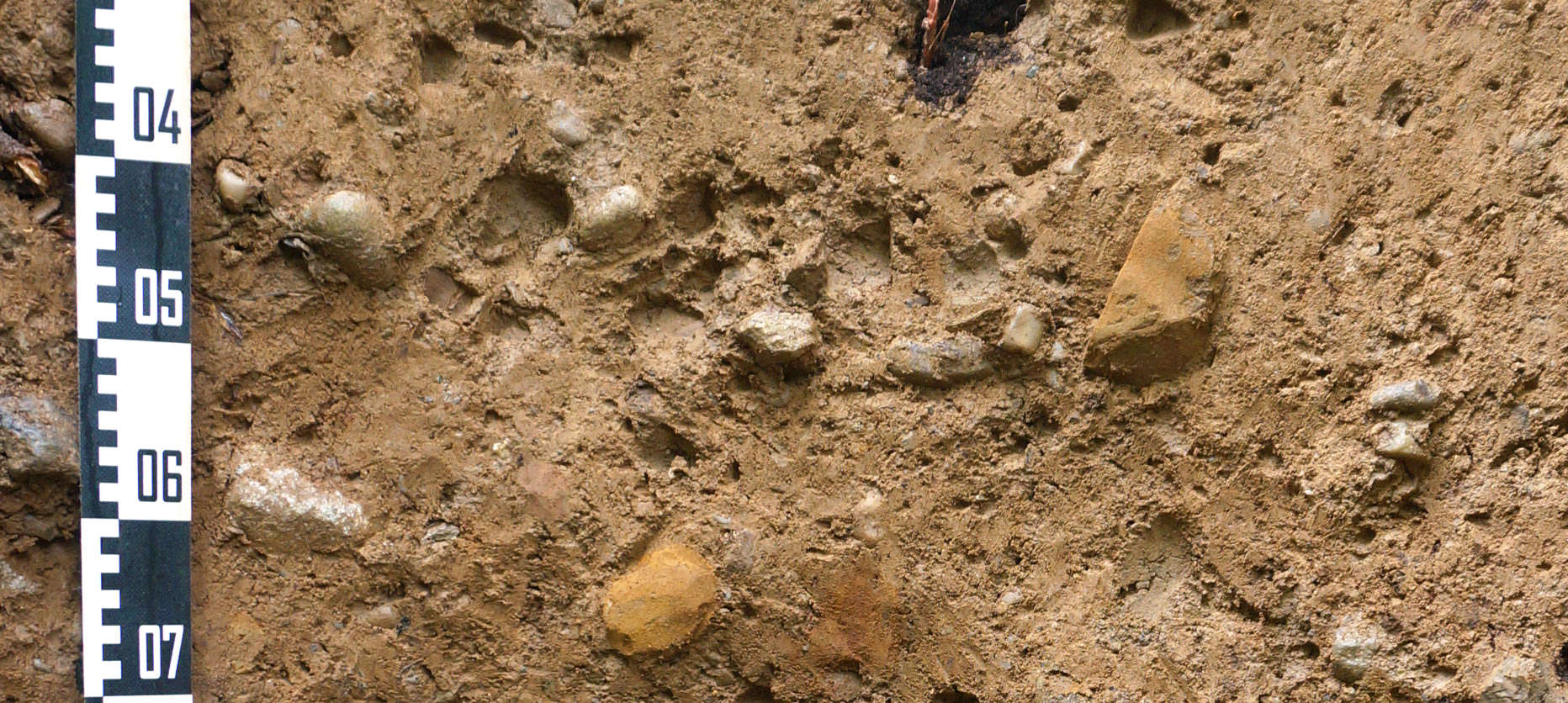 Wir befinden uns im forstwirtschaftlich genutzten Allmitwald (AW) und blicken auf einen anderthalb Metern tief reichenden braunen Boden. Dieser besteht aus Lehm und einigen gerundeten und eckigen Steinen. Der humusreiche Oberboden (Ah) ist zuoberst schwarz und wird nach unten dunkelbraun. In 15–45 cm Tiefe ist der Boden gelblichbraun (E), darunter nehmen rötliche Farbanteile, Grobmaterial und Tongehalte deutlich zu (It). An der Basis liegt helles, kalkhaltiges Material mit Spuren von Toneinwaschung (Ct).