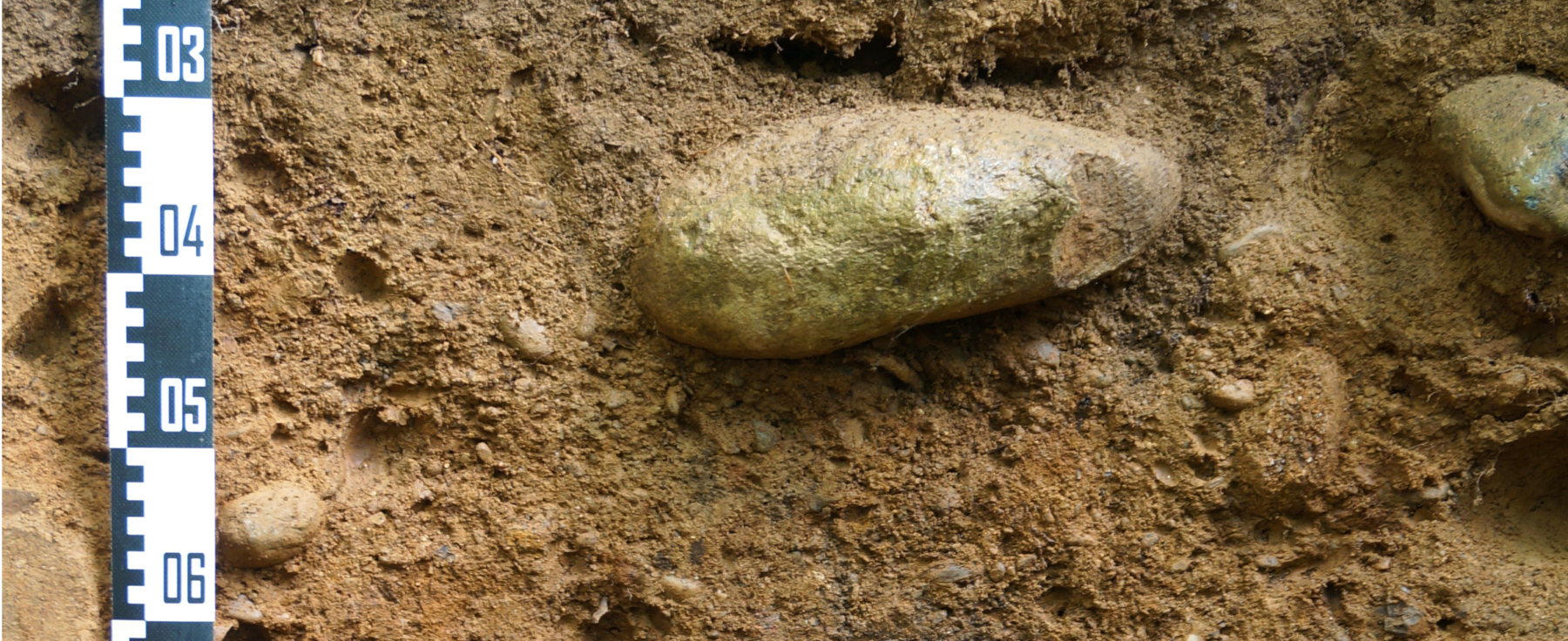 Wir stehen in einem Mischwald, 40 Meter über der Aare und betrachten einen 1 m mächtigen Boden, der aus Lehm und einigen gerundeten Steinen besteht. Der humose Oberboden (Ah) weist etwas dunklere Farben auf, vor allem gegenüber dem darunterliegenden gelbbraunen mineralischen Horizont (AE). Unterhalb eines halben Meters wird es rötlicher und toniger (It). Unter dem Boden sehen wir die grauen Aareschotter, teils mit Kalkbelägen an den Unterseiten der Steine (Ck).