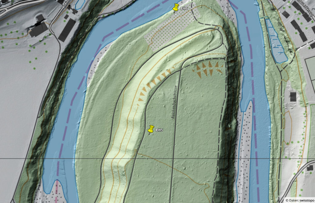 Das Profil ist in Aufbau und Entstehung mit dem Bodenprofil EH3 vergleichbar. Die hellere Farbe des Oberbodens lässt sich durch einen dauerhaft höheren Anteil an Laubbäumen erklären, deren Blätter leicht abbaubar (mineralisierbar) sind. Die gelb- bis rotbraunen Farben im humusarmen Unterboden werden durch verschiedene Eisenoxide (Rost) hervorgerufen. Der Tongehaltsanstieg nach unten hin resultiert aus dem Prozess der Tonverlagerung, welcher tausende Jahre dauert und kennzeichnend für den Bodentyp Parabraunerde ist. Mittlerweile ist der Boden stark versauert (pH-Wert < 5), so dass Tonverlagerung aktuell nicht mehr stattfindet. Dieser Boden hat sich aus kalkhaltigen Schottern der Aare gebildet, die nach dem Höhepunkt der letzten Eiszeit vor ca. 18‘000 Jahren abgelagert wurden. Die teils grossen Gesteinsbrocken zeigen, dass die Aare in der ausgehenden Eiszeit nahe des Gletschers sehr turbulent und kraftvoll strömte. Nach der Ablagerung der Schotter hat sich hier durch Hochwasser und Stürme noch etwas Feinmaterial abgelagert bevor unter dem aufkommenden Wald die Bodenbildung begann.