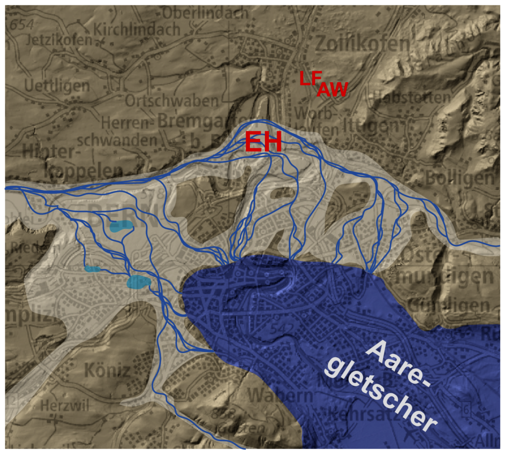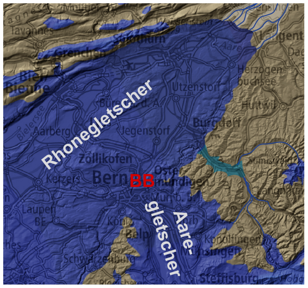 Vor 24‘000 Jahren waren am Höhepunkt der letzten Eiszeit weite Teile der Schweiz vergletschert. Bei Bern vereinigten sich der aus Südosten kommende Aaregletscher mit dem aus Südwesten kommenden Rhonegletscher. Das Eis war hier ca. 300 m mächtig. Der Gurten war eisbedeckt, während der Gipfelbereich des Bantiger noch aus dem Eis herausragte. Die Zunge des Aare-Rhone-Gletschers reichte fast bis Langenthal.